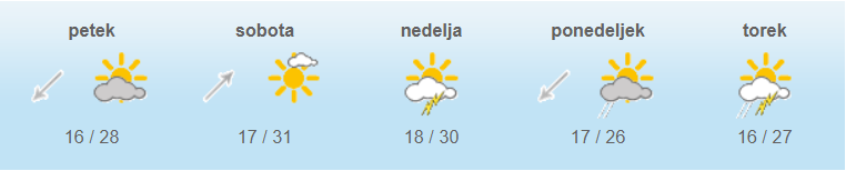 Najnižje jutranje temperature bodo od 12 do 18, najvišje dnevne od 28 do 33 stopinj Celzija.