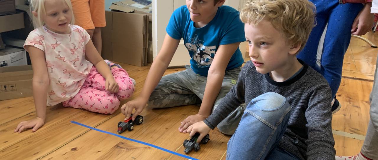 Sestavljanju avtomobilčkov je sledil preizkus hitrosti na pravem testnem poligonu in vzkliki: »Tri, štiri, zdaj! Tooo!«