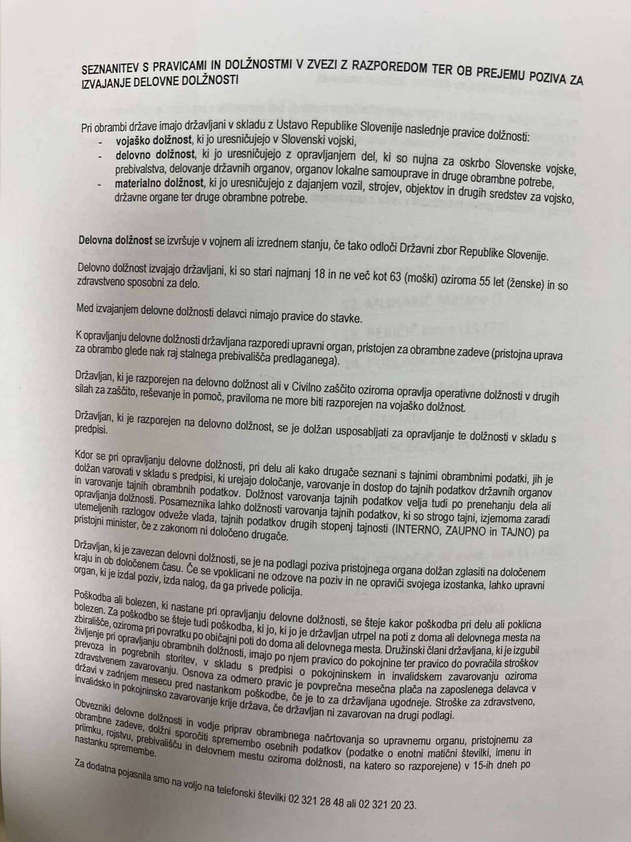 V seznanitvi so še poudarili, da razporejanje državljanov na delovno deležnost poteka že v miru, izvaja pa se v izrednem stanju ali vojni. Ne more pa se izvajati v primeru vaj in usposabljanja.