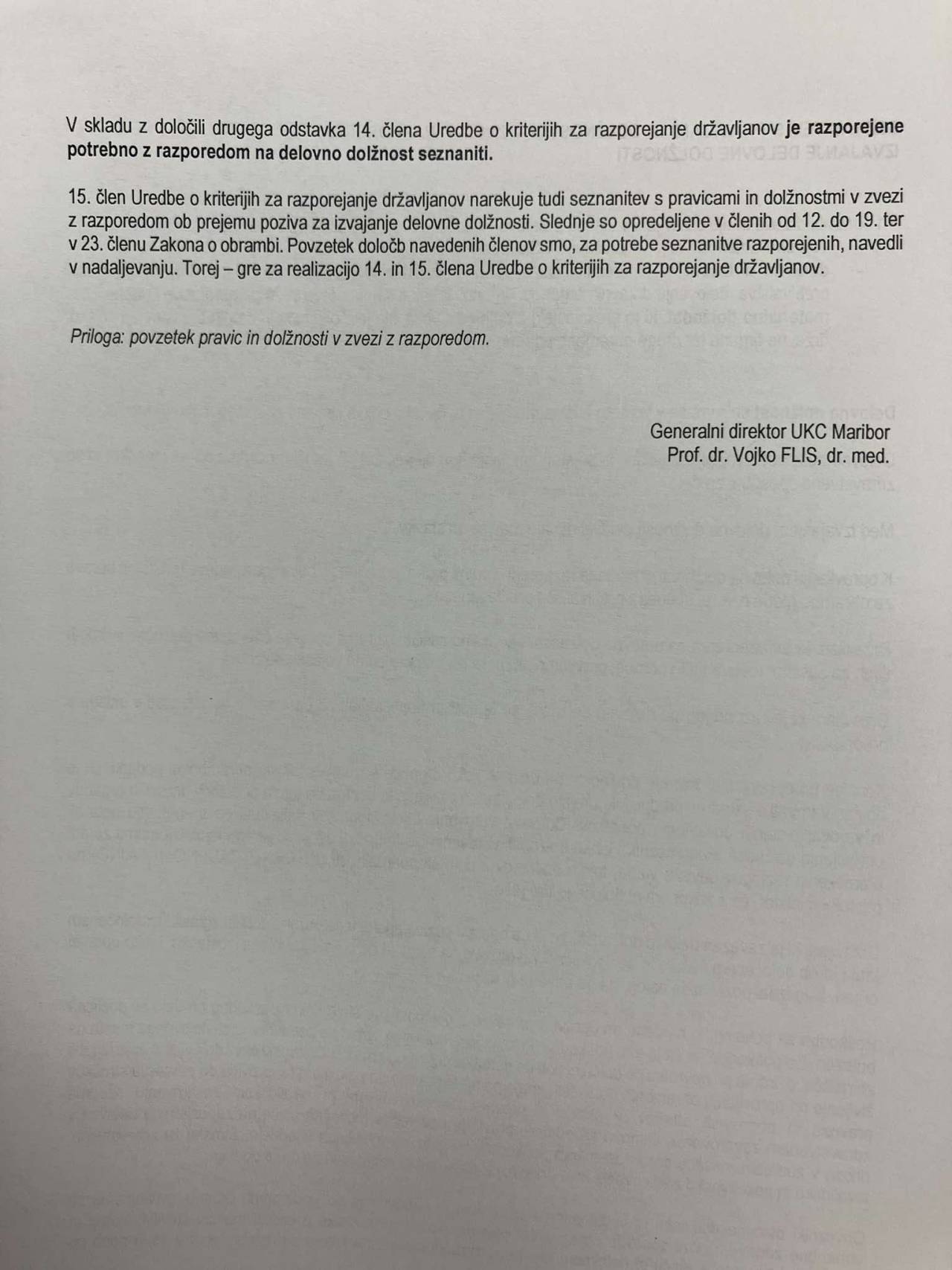 V seznanitvi o razporeditvi, ki ga je prejelo zdravstveno osebje Univerzitetnega kliničnega centra Maribor in pod katerim je podpisan generalni direktor Univerzitetnega kliničnega centra Maribor Vojko Flis, je med drugim poudarjeno, da je delovna dolžnost poleg vojaške in materialne dolžnosti ena od obrambnih dolžnosti Republike Slovenije.