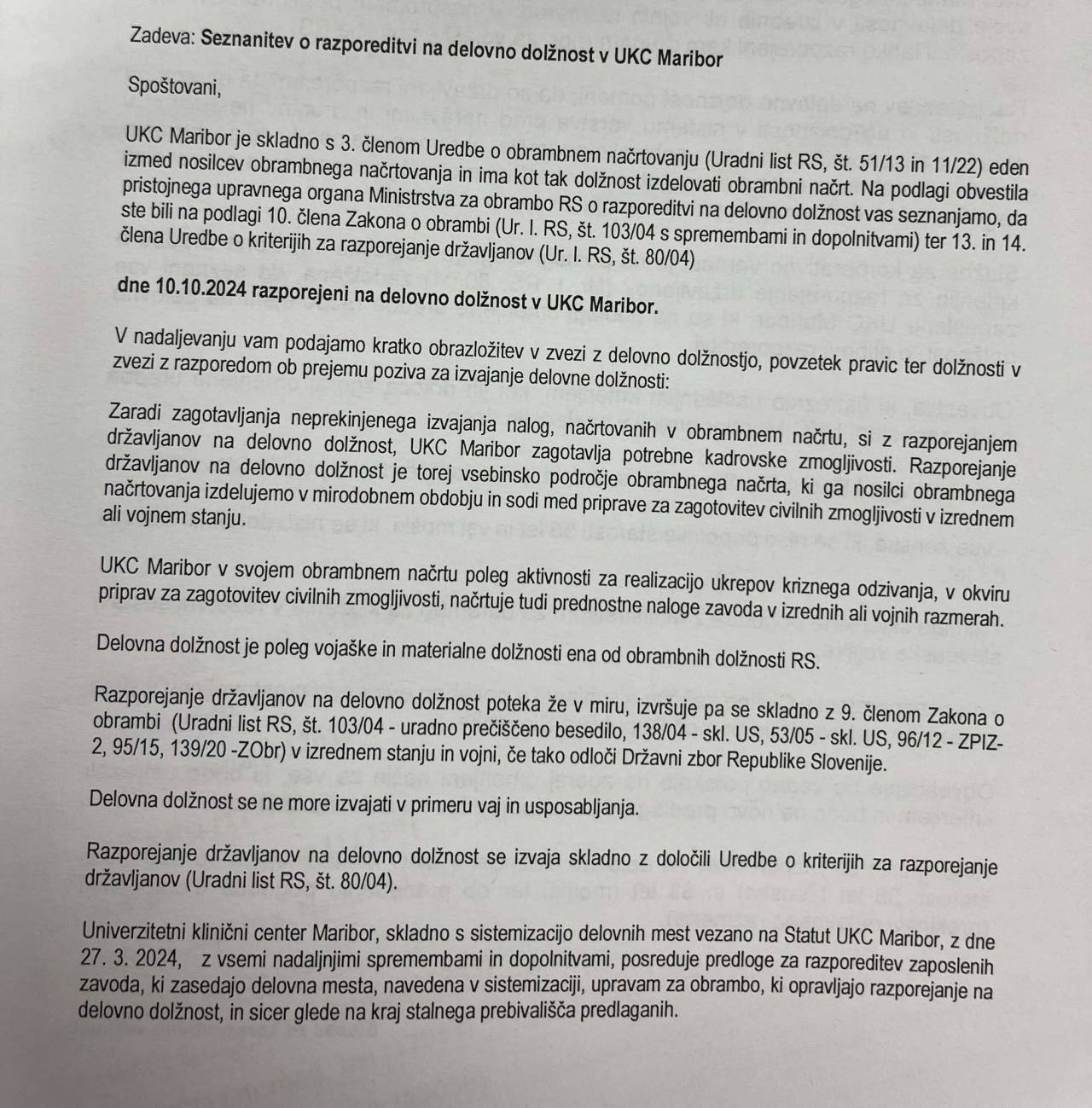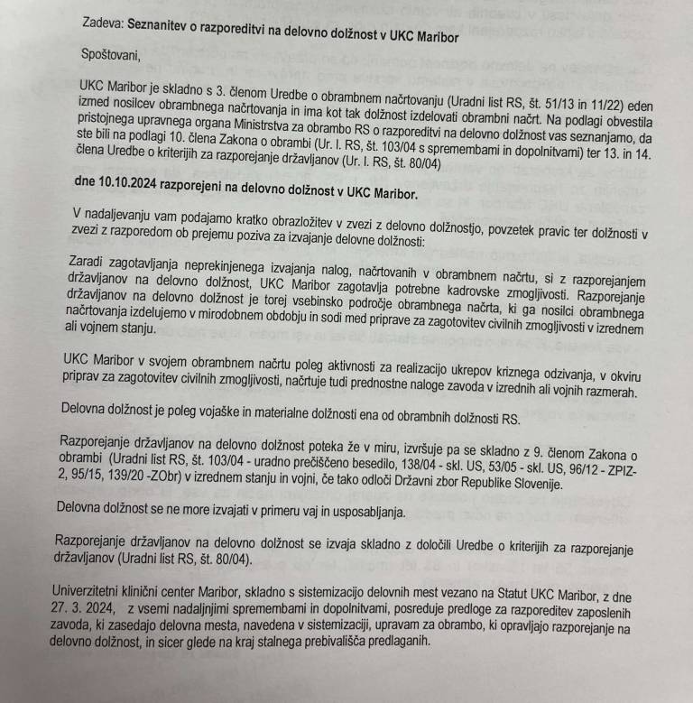 Kot smo izvedeli, gre za seznanitev o razporeditvi na delovno dolžnost v Univerzitetni klinični center Maribor v primeru izrednih razmer.