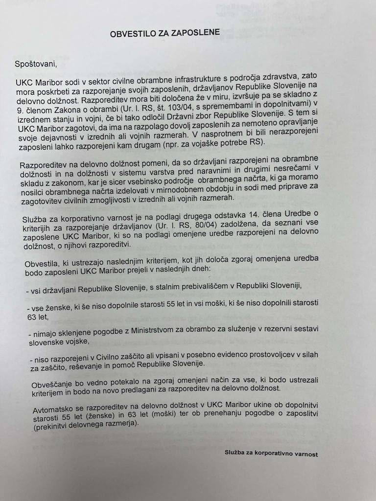 Obvestilo za zaposlene navaja, da Univerzitetni klinični center Maribor spada v sektor civilne obrambne infrastrukture na področju zdravstva in je zato dolžan zagotoviti razporejanje zaposlenih na delovno dolžnost, skladno z zakonom o obrambi.