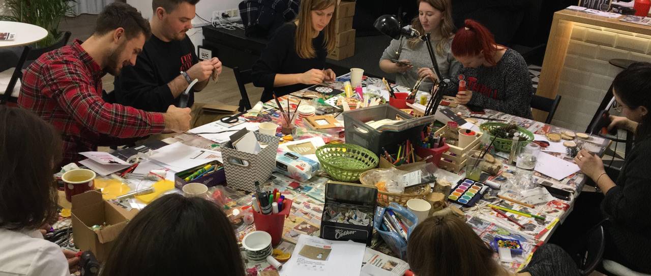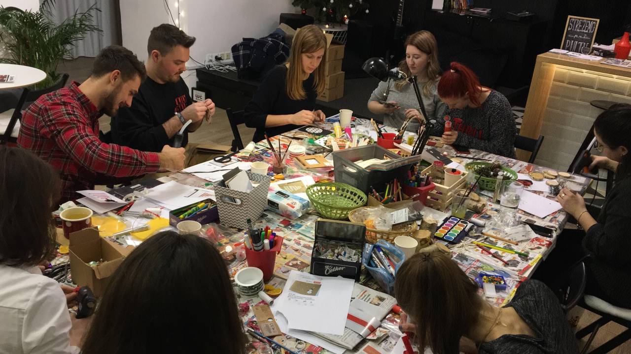 V Pisarni so zato pripravili pravo božično delavnico – izdelovali so voščilnice, obeske za jelko iz naravnega materiala, pakirali so piškotke ...