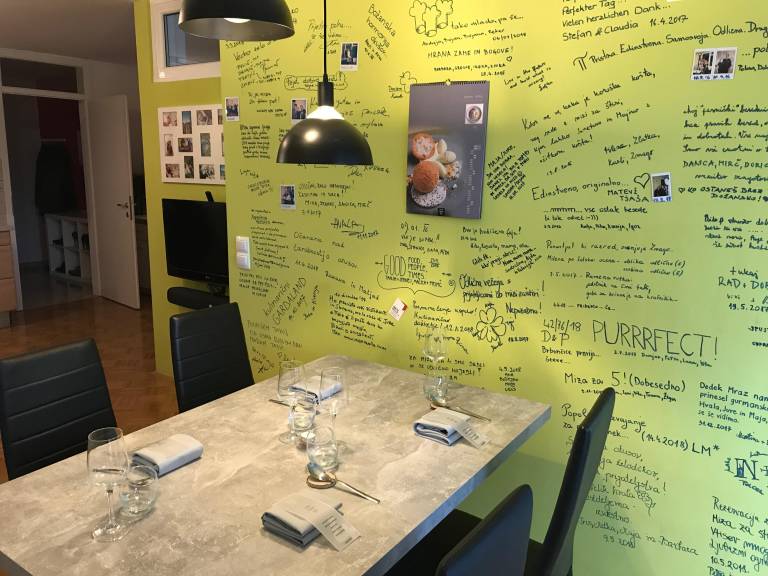 »Na začetku se nama je zdelo, da bi to lahko bil problem, ampak potem pa sva ugotovila, da je gostom tudi to zanimivo. Pravzaprav so na neke vrste izobraževanju, marsikaj se lahko naučijo. Kdor želi, lahko tudi kaj poskusi narediti z nama,« namigne Jure. A tako kot večina, tudi mi raje ostanemo za mizo in mlad par opazujemo pri delu. Čeprav smo v tujem stanovanju, se že po nekaj minutah počutimo povsem domače.