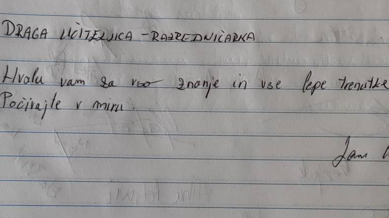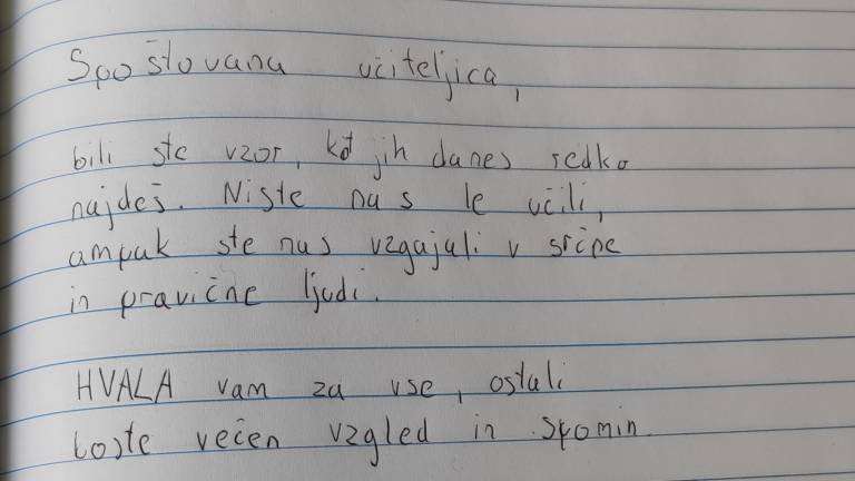 Vsi sodelavci so se pokojni učiteljici danes poklonili na žalni slovesnosti, ki so jo zaradi epidemioloških razmer izpeljali preko zooma. A ravnateljica je prepričana, da to ni edina oblika spomina nanjo, saj bo, kot pravi, pokojna ostala svetel vzor tega, kakšen človek mora biti dober učitelj.