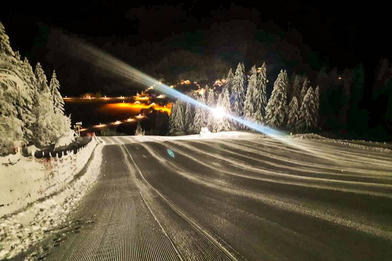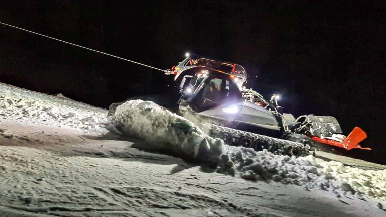 V Kranjski Gori je po deževnem zalivanju proge zapadlo pol metra snega, ki so ga vso noč obdelovali s teptalci.