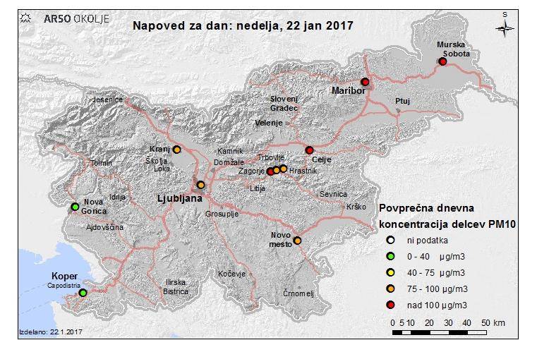 "Danes pričakujemo zelo visoko onesnaženost zraka z delci PM10 v Murski Soboti, Mariboru, Celju in Zagorju, v ostalih dolinah in kotlinah celinske Slovenije pa bo onesnaženost zraka z delci visoka. Na Primorskem bo onesnaženost nizka," so za današnji dan zapisali pri Arsu.