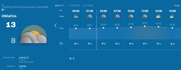 Agencija Republike Slovenije za okolje napoveduje, da bo v Mariboru in okolici hitrost vetra dosegla do 27 kilometrov na uro, sunki pa bi naj dosegli tudi do 65 kilometrov na uro.