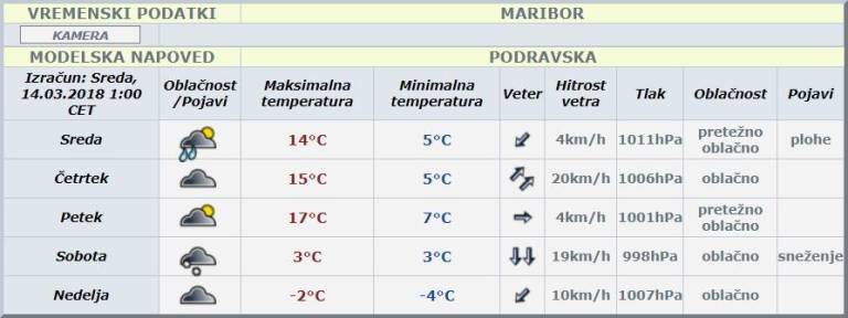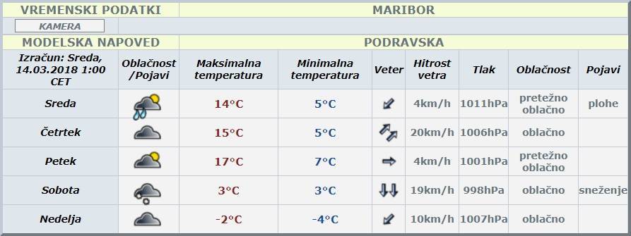 V petek bodo padavine zajele vso državo, meja sneženja pa bo med 800 in 1200 metrov. Padavine bodo hitro oslabele in že dopoldne ponehale, nato pa se bo prehodno razjasnilo. V Mariboru bi se tako v petek čez dan lahko ogrelo vse do 17 stopinj Celzija. V noči na soboto pa sledi velik vremenski preobrat.