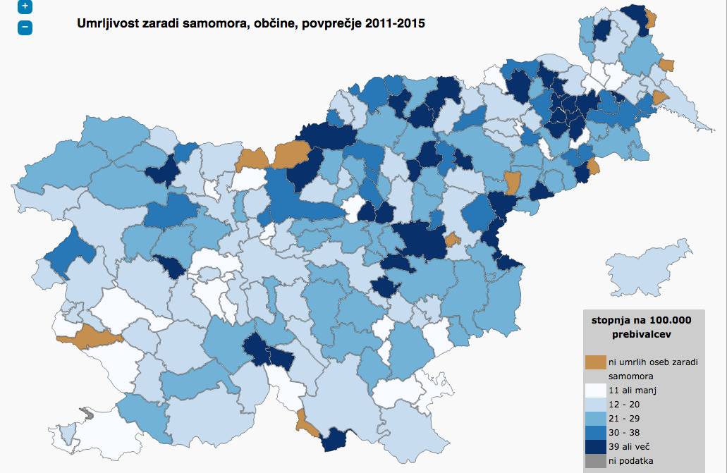 V omenjenih podravskih občinah pa se stopnja umrljivosti zaradi samomora giblje 39,2 od do 93,5.