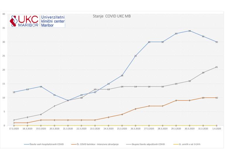 Skupno število hospitaliziranih pacientov zaradi covid-19 v Univerzitetnem kliničnem centru Maribor je 30, od tega je dvanajst pacientov v intenzivni enoti, vseh dvanajst je intubiranih na ventilator.
