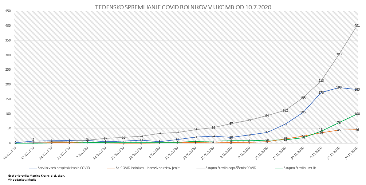 Trenutno je v mariborski bolnišnici skupno hospitaliziranih 216 oseb s covid-19, intenzivno zdravljenje potrebuje 47 bolnikov. Število umrlih je naraslo na 102.