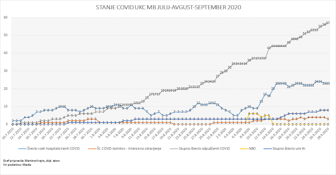 V Univerzitetnem kliničnem centru Maribor je trenutno na navadnem covid oddelku 22 bolnikov s koronavirusom, na covid intenzivnemu oddelku pa trije bolniki. Bolnišnica ima še 25 prostih kapacitet za bolnike s koronavirusom na navadnem oddelku in štiri na intenzivnem oddelku.