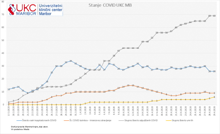 V zadnjih štiriindvajsetih urah sta v Sloveniji zaradi okužbe s koronavirusom umrli dve osebi, od tega ena v Univerzitetnem kliničnem centru Maribor. Število umrlih, okuženih s koronavirusom, v mariborskem kliničnem centru je s tem naraslo na šest.