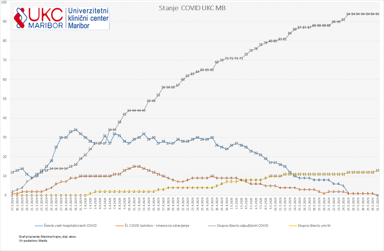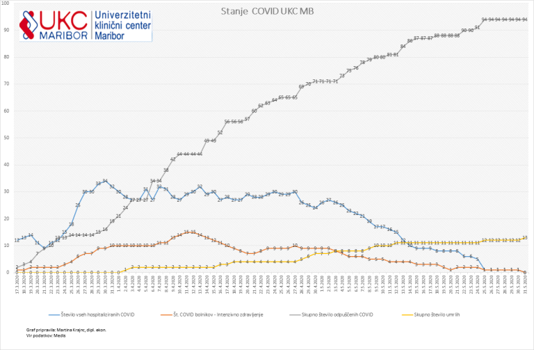 Skupno je bilo v mariborskem kliničnem centru v obdobju prvega vala epidemije koronavirusa ozdravljenih 94 ljudi s covid-19, trinajst jih je zaradi te bolezni izgubilo življenje.