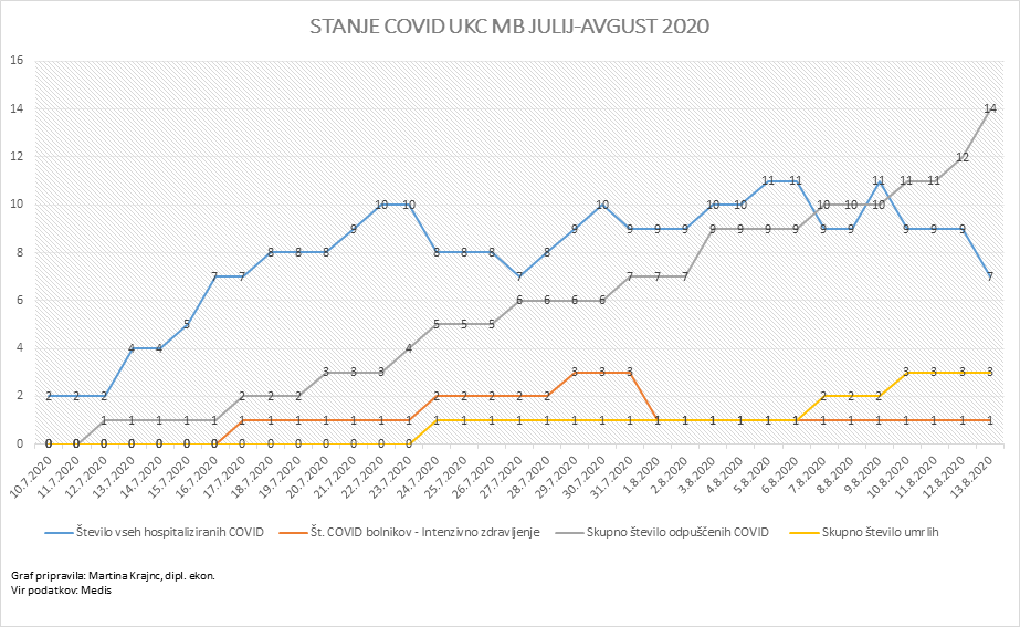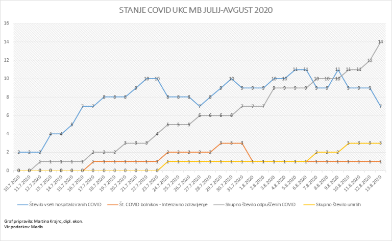 V Univezitetnem kliničnem centru Maribor je danes sedem bolnikov s covid-19, eden je na intenzivnem zdravljenju. Od 10. julija pa do današnjega dne so iz bolnišnice odpustili 14 bolnikov, okuženih s koronavirusom, trije so umrli.