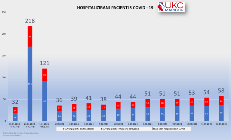 Tako, če je bilo v začetku septembra v Univerzitetnem kliničnem centru Maribor hospitaliziranih 36 bolnikov, jih danes beležijo že 58, od tega je na intenzivnem zdravljenju 21 pacientov, na akutnem oddelku pa 37 pacientov.