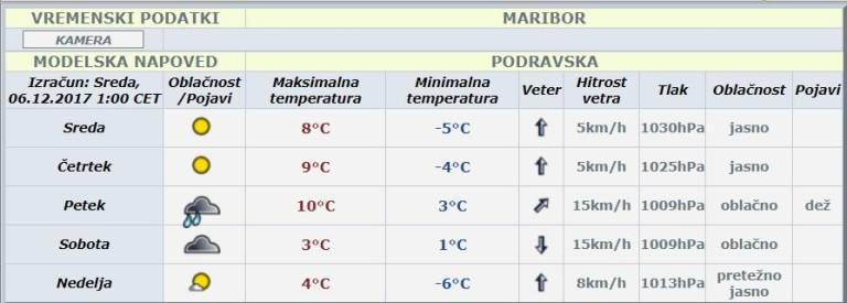 Tudi v začetku prihodnjega tedna se bodo pojavljale padavine. V ponedeljek se bo od zahoda pooblačilo, padavine bodo zajele večji del Slovenije. Nestanovitno vreme se bo nadaljevalo do petka. Po nižinah bo deloma deževalo, deloma snežilo. Pa bo snežno odejo dočakal tudi Maribor? Ta teden še ne, več možnosti za sneg v Mariboru pa naj bi bilo v ponedeljek zjutraj.