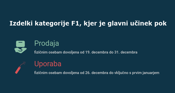 Nekateri pirotehnični izdelki so na trgovskih policah sicer celo leto, prodaja ognjemetnih izdelkov F1. kategorije, katerih glavni učinek je pok - to so pokajoče žabice, pok vrvica, pokajoče kroglice, pa je fizičnim osebam dovoljena od 19. do 31. decembra, njihova uporaba pa od 26. decembra do vključno 1. januarja.