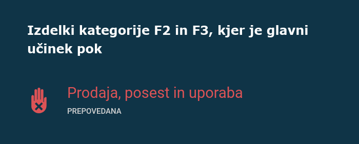 Prodaja, posest in uporaba pirotehničnih izdelkov kategorije F2 in F3, katerih glavni učinek je pok, je prepovedana. To so petarde različnih oblik in moči. Prodaja pirotehničnih izdelkov F1. kategorije - kot so tortne fontane, čudežne svečke, pasje bombice, pokajoče kroglice, iskrice - ni dovoljena mlajšim od 14 let, prodaja pirotehničnih izdelkov 2. kategorije - kot so rakete, rimske svečke - pa ni dovoljena mlajšim od 16 let.