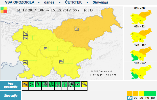 Danes do zgodnjega popoldneva bodo najmočnejši sunki vetra na severovzhodu države ter ponekod v višjih legah dosegali hitrost okoli 70 kilometrov na uro. Veter bo ponovno dosegal hitrost okoli 80 kilometrov na uro v drugem delu noči na petek in v petek dopoldne predvsem na severovzhodu ter na Notranjskem.