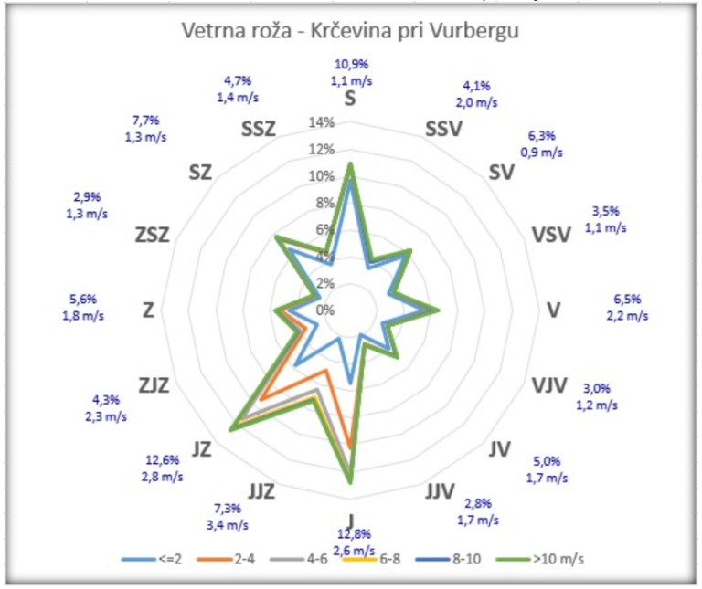 Iz vetrne rože vidimo, da v Krčevini pri Vurbergu najmočnejši vetrovi pihajo iz smeri jugo-jugozahoda.