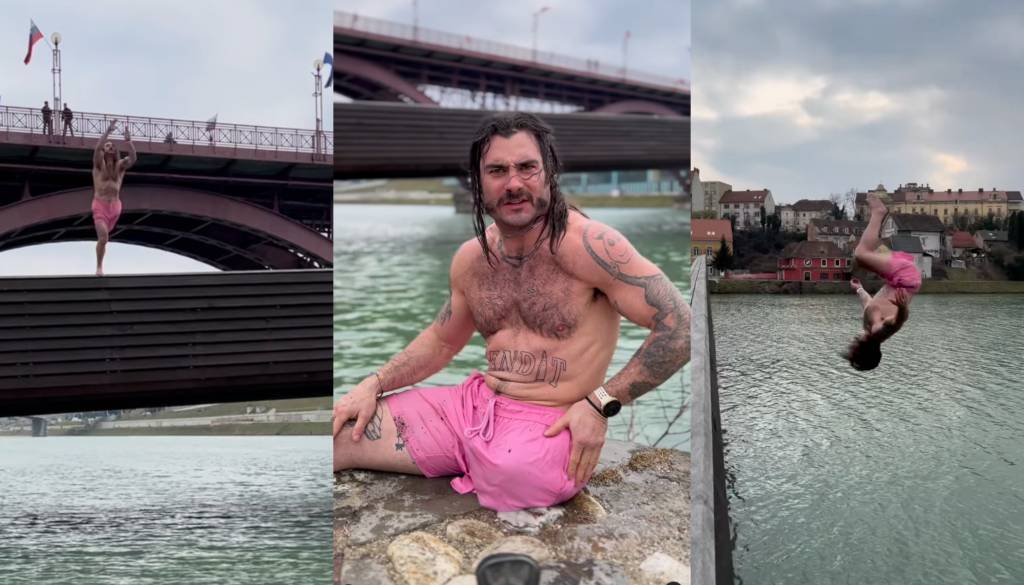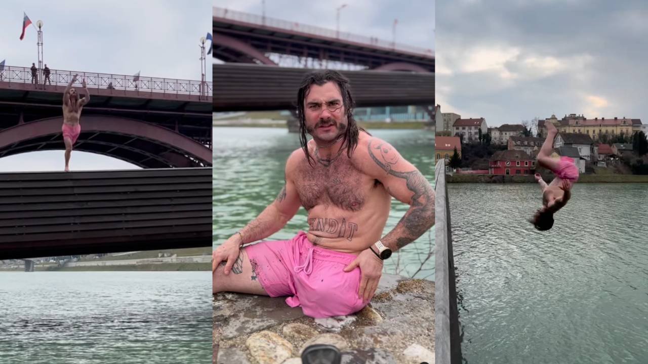 V videu, ki ga je delil s svojimi sledilci, se vidi, kako brez pomisleka skoči iz Splavarske brvi naravnost v reko Dravo, nato pa občuduje eno največjih znamenitosti mesta – najstarejšo trto na svetu na Lentu.