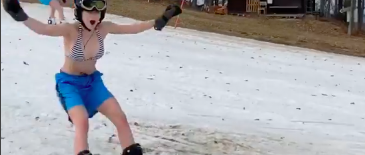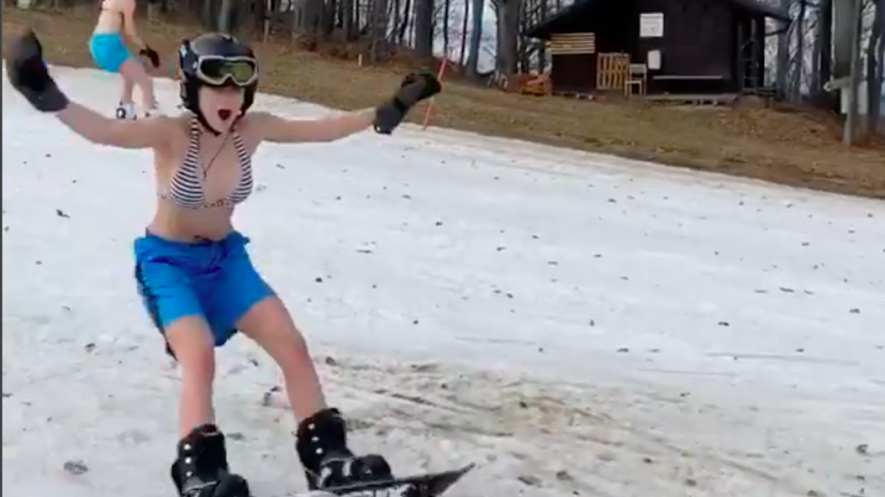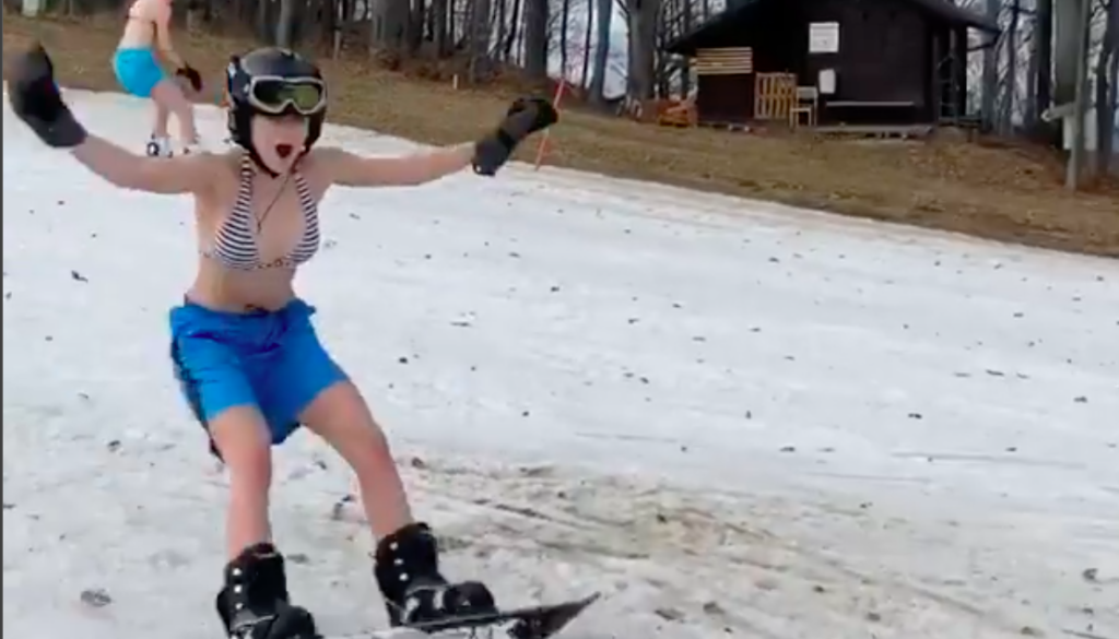 Kakšna zima! Mimo Koče Luka sta danes deskali na snegu dekleti v kopalkah.