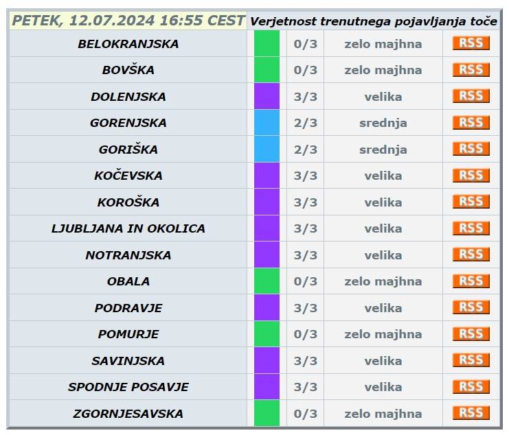 Agencija Republike Slovenije za okolje je Dolenjsko, Kočevsko, Koroško, Ljubljano z okolico, Notranjsko, Savinjsko in Spodnje Posavje izdala vijoličasto opozorilo za veliko verjetnost trenutnega pojavljanja toče.