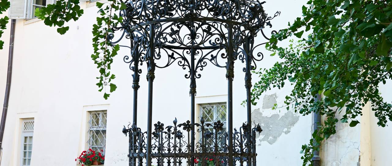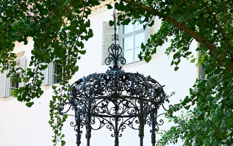 Kovana železna mreža s spiralasto prepletenim listnim in cvetnim okrasjem, ki se zaključuje v obliki krone je zelo verjetno dodana naknadno in jo lahko datiramo v (pozno) 19. stoletje. Vrh kovinske konice krasi kovana zastavica.
