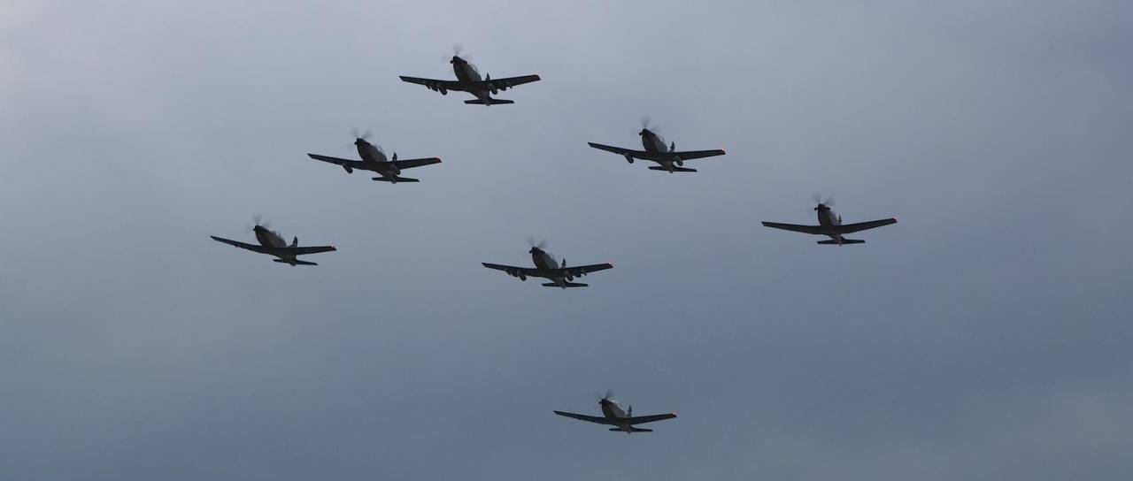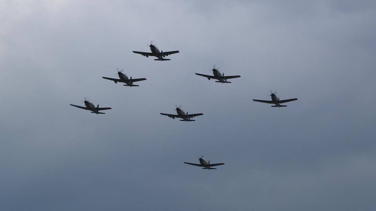 Sedem vojaških letal pilatus PC-9M, turbopropelerska šolska letala, ki s svojo elektronsko opremo omogočajo »nadaljevalno šolanje, osnovno bojno usposabljanje in predstavljajo prehodni tip med letali za šolanje in bojnimi letali«, je letelo v tako imenovani ptičji oziroma Rex1 formaciji. Razdalja med letali je med letom znašala le nekaj metrov. Slovenska vojska ima trenutno devet letal PC-9M.