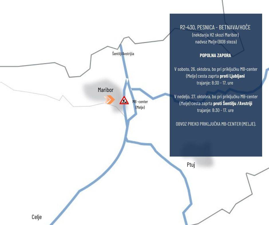 V soboto, 26. oktobra, bo pri priključku Maribor-center (Melje) cesta med 8:30 - 17. uro zaprta proti Ljubljani.