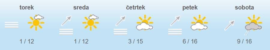 Popoldne se bo na Primorskem začelo oblačiti. Ponekod bo zapihal jugozahodnik. Najnižje jutranje temperature bodo od minus tri do dve, ob morju okoli sedem, najvišje dnevne od 11 do 15, v krajih z dolgotrajnejšo meglo okoli šest, na Primorskem okoli 16 stopinj Celzija.