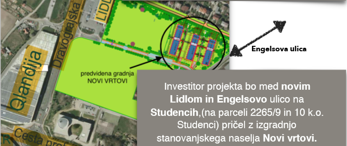 Investitor projekta bo med novim Lidlom in Engelsovo ulico na Studencih – na parceli 2265/9 in 10 k.o. Studenci – pričel z izgradnjo stanovanjskega naselja Novi vrtovi.