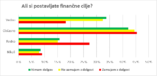 Prav takšne tvegane odločitve in nerazumevanje morebitnih posledic lahko pripeljejo do nezmožnosti odplačevanja dolgov in prezadolženosti. Zato na ZPS poudarjajo, da je za finančno varnost posameznika ali družine izjemnega pomena, da si znamo postaviti finančne cilje. Pomembnost finančnega načrtovanja so na ZPS ponazorili tudi z grafom, iz katerega je razvidno, da si finančne cilje pogosteje zastavijo tisti, ki dolgov nimajo oziroma ne zamujajo z njihovim odplačevanjem, redkeje pa tisti, ki zamujajo z odplačevanjem finančnih obveznosti.