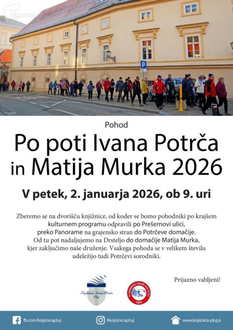 Knjižnica Ivana Potrča Ptuj in Planinsko društvo Ptuj vabita na tradicionalni novoletni pohod po ptujski kulturni poti v petek, 2. januarja 2026, ob 9.00.