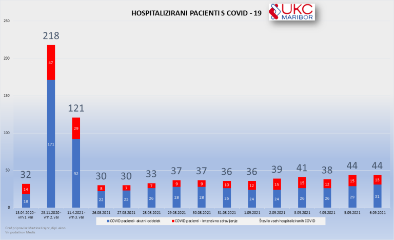 Kot so za Mariborinfo sporočili iz Univerzitetnega kliničnega centra Maribor, je v bolnišnici trenutno hospitaliziranih 44 covid bolnikov. Od tega se 13 pacientov zdravi v intenzivni terapiji.