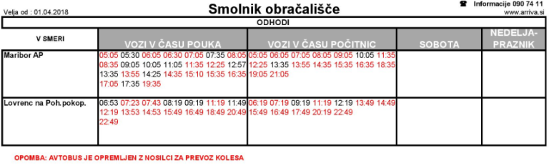 Tako so ob sobotah, nedeljah in praznikih vsi avtobusi, ki vozijo na relaciji, opremljeni z nosilcem za prevoz koles, medtem ko med delavniki tisti, ki vozijo dopoldan in predvsem popoldan.