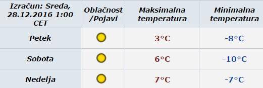 Zadnji dan v letu naj bi se po napovedih vremenoslovcev v Mariboru temperatura spustila do -10 stopinj Celzija. Čez dan se bo sicer ozračje ogrelo do šestih stopinj nad lediščem, a tudi na novega leta dan naj bi se jasno in mrzlo vreme nadaljevalo.