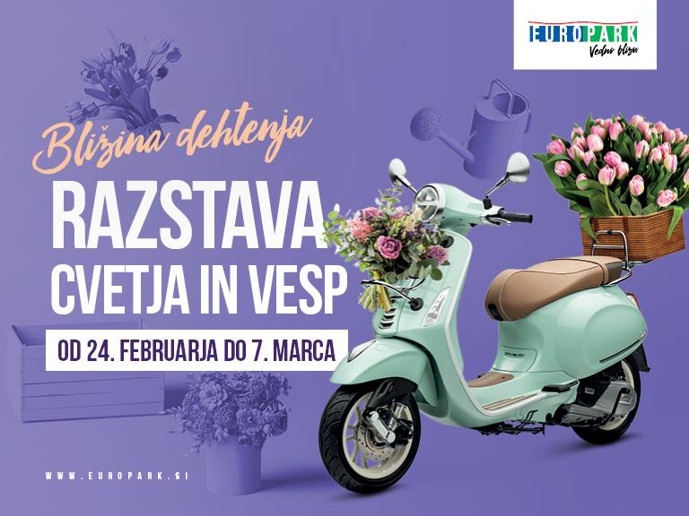 Letos so tradicionalno razstavo cvetja v največjem štajerskem nakupovalnem središču nadgradili s kultnimi vespami, za katerimi se že več kot sedem desetletij obračajo pogledi.