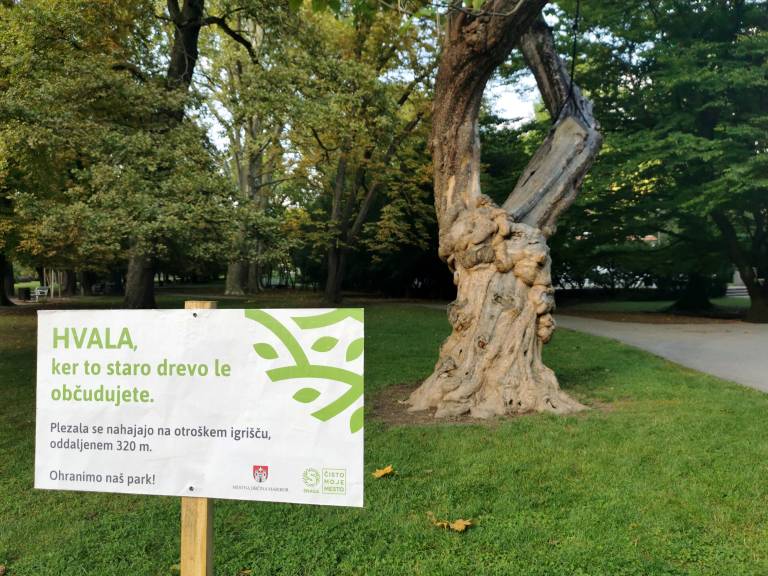 Snaga Maribor je v Mestnem parku drevo cigarovec opremila z napisom: »Hvala, ker staro drevo le občudujete.«