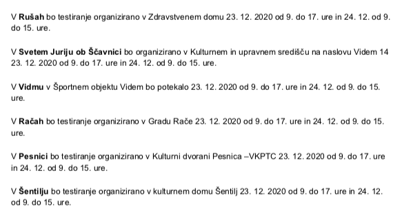 So pa infomacije o napovedanem testiranju z napačno časovnico še vedno navedene na seznamu lokacij množičnega testiranja s hitrimi testi po Sloveniji. Dodatne lokacije so aktivirali zaradi velikega zanimanja.