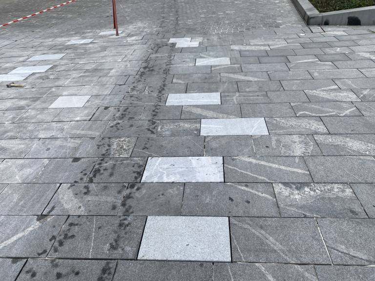 Pri tovrstnih ploščah zgornjo pohodno plast (debeline tri centimetre) sestavlja naravni kamen (granodiorit oziroma granit) skladno z zahtevami Zavoda za varstvo kulturne dediščine. Ta plast je nalepljena na betonski podstavek debeline 15 centimetrov, kar predstavlja »premišljeno tehnično rešitev z vidika trajnosti in videza.«