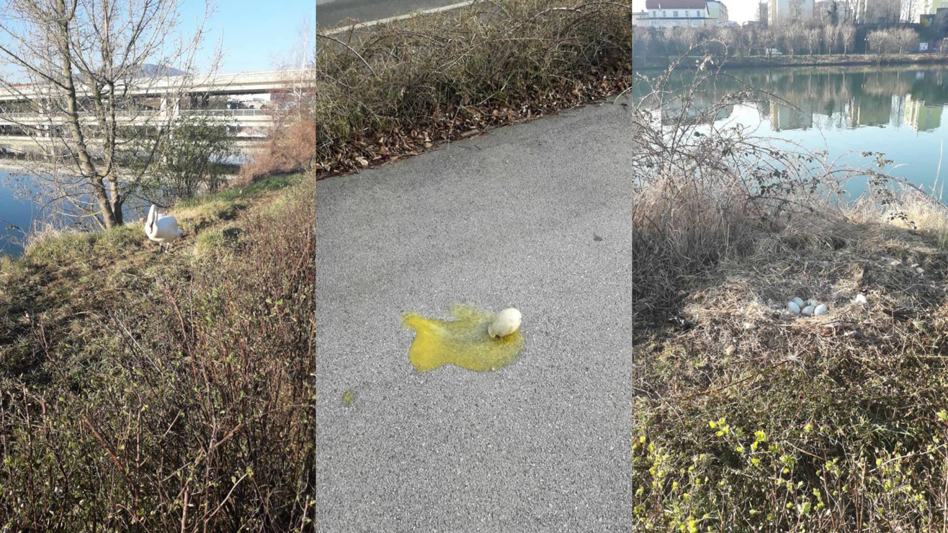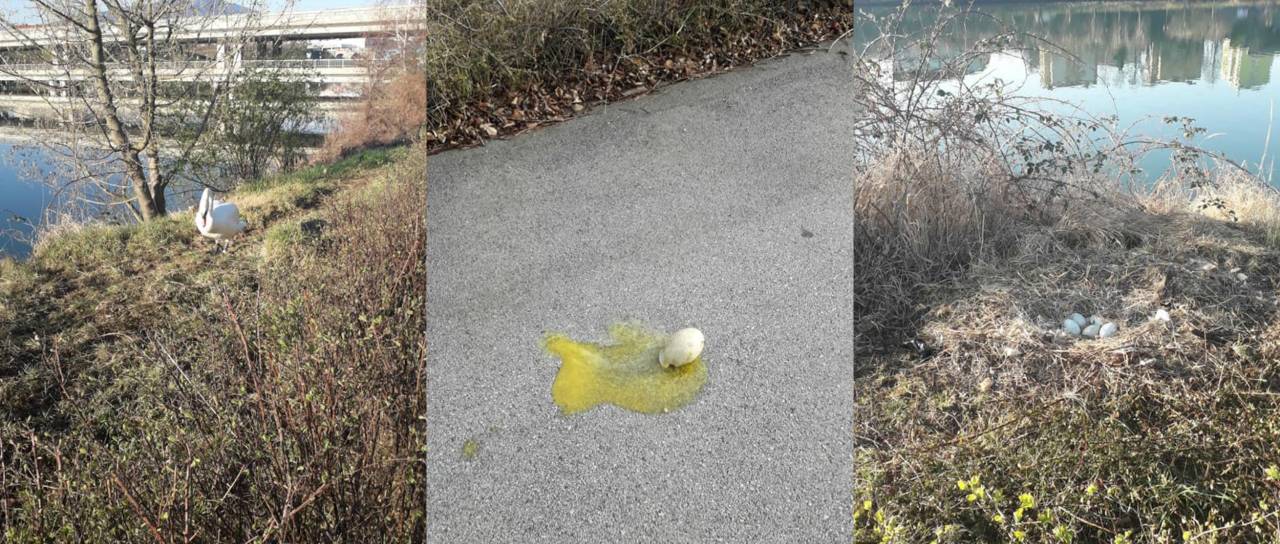 Na Oreškem nabrežju nasproti Livarne ob Dravi že več let gnezdi labodji par. Pred tednom dni je bilo v gnezdu še pet jajc, včeraj pa je po pričanju bralke vseh pet jajc razbitih ležalo na pločniku.