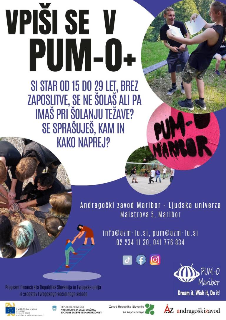 Projektno učenje mlajših odraslih PUM-O+ vabi k vpisu mladostnike stare od 15 do 29 let, ki so brez končane izobrazbe, brez zaposlitve in prijavljeni na Zavodu Republike Slovenije za zaposlovanje.