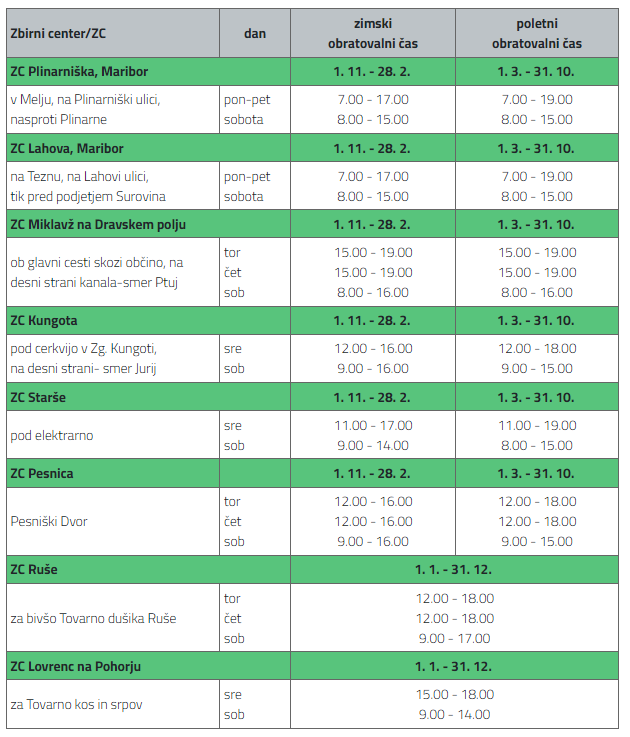 Snaga Maribor občane opozarja, da v zbirnih centrih z novembrom prehajajo na zimski obratovalni čas. Pri tem sta izjema zbirna centra v občini Ruše in Lovrenc na Pohorju, v katerih je obratovalni čas skozi celotno leto enak.