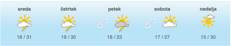 Jutranje temperature bodo od 15 do 20, najvišje dnevne od 24 do 30, v jugovzhodni Sloveniji do 32 stopinj Celzija.