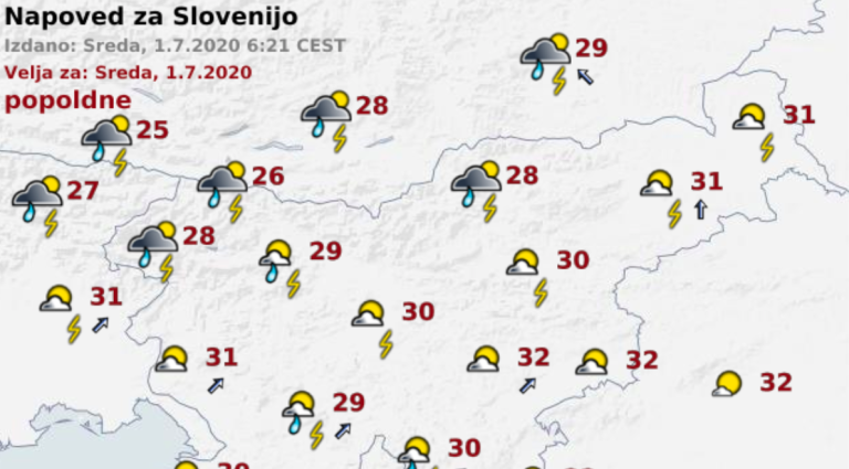 Popoldne in zvečer bo nastalo nekaj krajevnih ploh in neviht. Najvišje dnevne temperature bodo od 26 do 31, v jugovzhodni Sloveniji do 33 stopinj Celzija.
