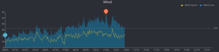 Včeraj od 8. ure naprej so sunki vetra tako ves čas presegali hitrost 35 kilometrov na uro (9,7 metrov na sekundo).