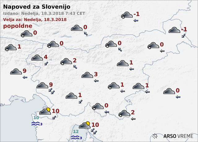 Jutri bo oblačno. Ponekod v notranjosti bo občasno še rahlo snežilo. Pihal bo veter vzhodnih smeri, na Primorskem zmerna burja. Najvišje dnevne temperature bodo okoli 0, na Primorskem do 7 °C.